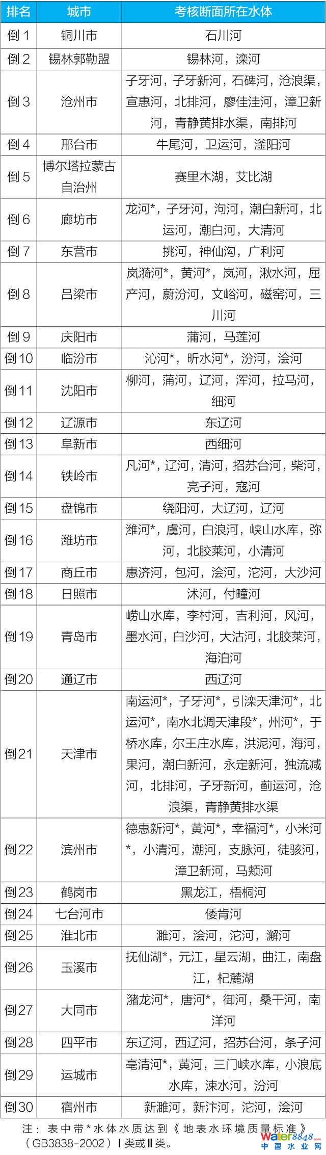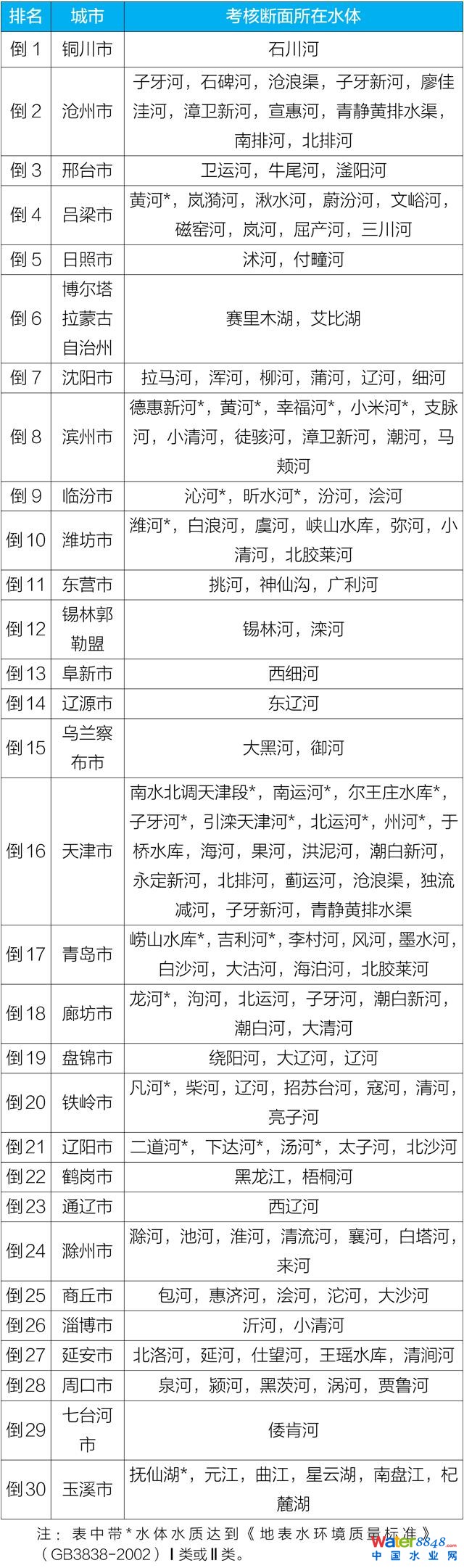 2020年1-3月國家地表水考核斷面水環(huán)境質(zhì)量狀況排名后30位城市及所在水體