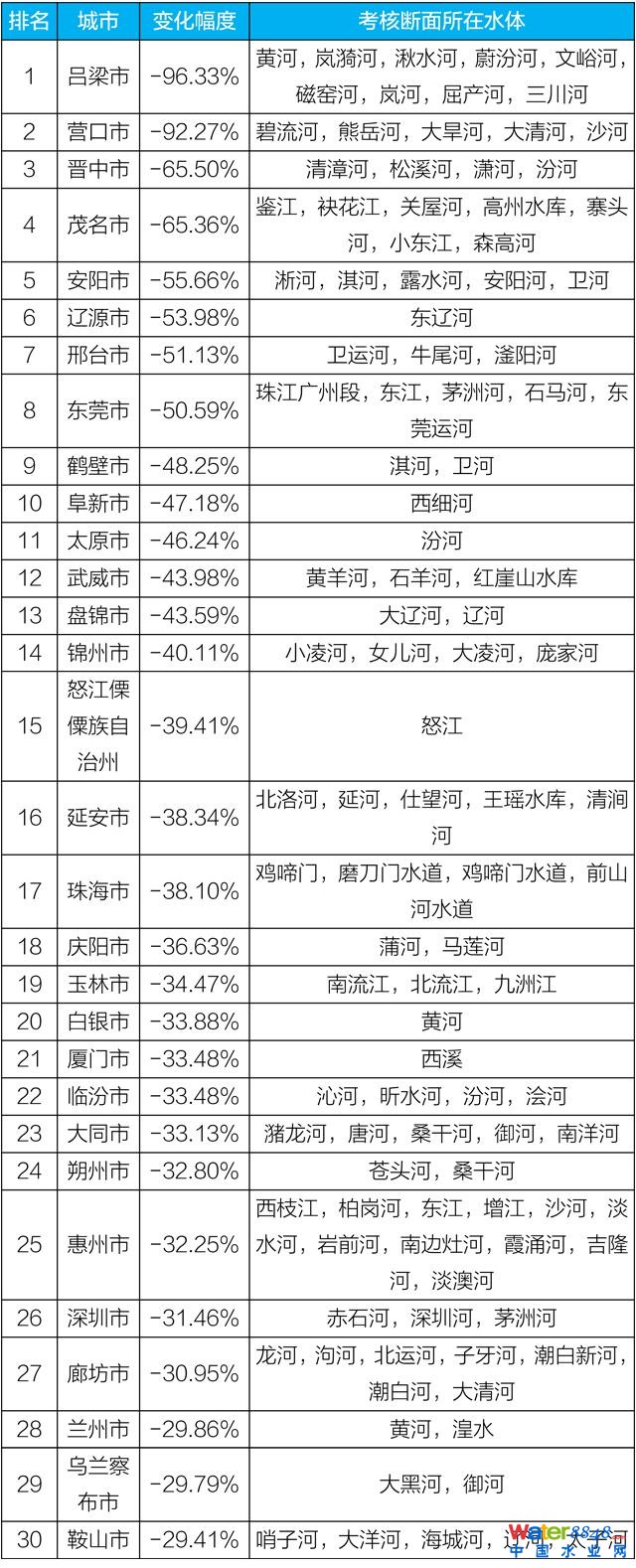 2020年1-3月國家地表水考核斷面水環(huán)境質(zhì)量變化情況排名前30位城市及所在水體