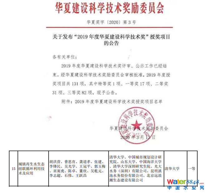 近日,由住房和城鄉(xiāng)建設部科技與產(chǎn)業(yè)化發(fā)展中心承辦的2019年度“華夏建設科學技術(shù)獎”獲獎名單相繼揭曉,通過專業(yè)組和評審委員會兩級評審,本年度共評出推薦授獎項目134項,其中特等獎1項、一等獎17項、二等獎32項、三等獎84項。昆明滇池水務股份有限公司與清華大學等校企聯(lián)合申報的“城鎮(zhèn)再生水生態(tài)紐聯(lián)循環(huán)利用技術(shù)及應用”被評為一等獎。