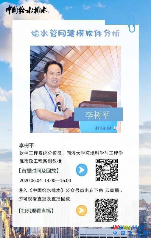 本周四(6月4日)下午14:00-16:00,題目:給水管網(wǎng)建模軟件分析,時間:2020年 6月4日,主講人:李樹平,工學(xué)博士,系統(tǒng)分析員,同濟環(huán)境科學(xué)與工程學(xué)院 副教授 。 “給水管網(wǎng)建模軟件分析…
