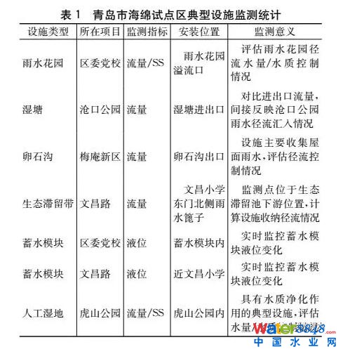 根據(jù)住建部出臺(tái)的《海綿城市建設(shè)典型設(shè)施設(shè)計(jì)參數(shù)與監(jiān)測(cè)效果要求》,需要對(duì)生態(tài)滯留設(shè)施、植草溝、CSO調(diào)蓄池、干塘、濕塘、人工濕地和綠色屋頂進(jìn)行在線監(jiān)測(cè)。根據(jù)典型設(shè)施的構(gòu)造和主要效果進(jìn)行在線監(jiān)測(cè)指標(biāo)的篩選:對(duì)于以水量控制為主的設(shè)施,需在線監(jiān)測(cè)水量情況,其中調(diào)蓄池和雨水桶具有穩(wěn)定液面,可進(jìn)行液位監(jiān)測(cè);對(duì)于水質(zhì)具有明顯凈化效果的設(shè)施則應(yīng)進(jìn)行SS的在線監(jiān)測(cè)。青島市海綿試點(diǎn)區(qū)典型設(shè)施監(jiān)測(cè)情況如表1所示。