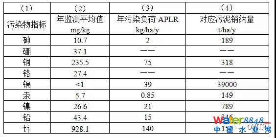 根據第(4)欄計算結果對應污泥銷納量最小值為149t/ha/y,按照365d/y,200t/d污泥產量計算,需要銷納土地面積490ha,銷納重點監(jiān)測元素確定為Hg和Zn。