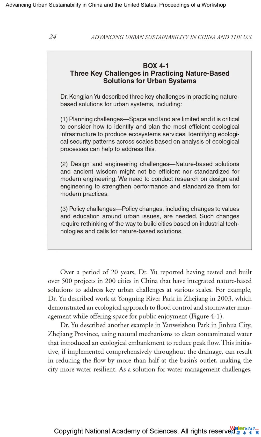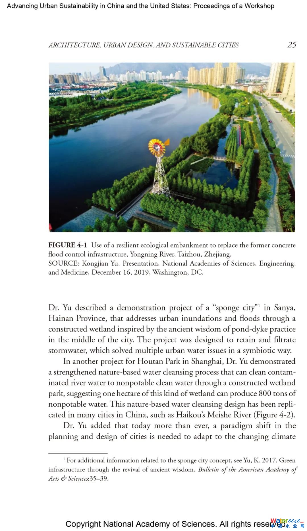 在關(guān)于中美兩國的建筑、城市設(shè)計和可持續(xù)城市的主題研討中,與會人員著重討論了基于自然的解決途徑和海綿城市研究。報告指出,俞孔堅所倡導(dǎo)的基于自然的解決途徑對于城市可持續(xù)發(fā)展至關(guān)重要。中國大部分城市都面臨著一系列復(fù)雜的生態(tài)和環(huán)境問題:洪水、城市內(nèi)澇、干旱、地下水減少、水污染、空氣污染、棲息地減少等,而目前的灰色基礎(chǔ)設(shè)施不足以解決這些相互關(guān)聯(lián)的問題。他提倡復(fù)興中國傳統(tǒng)農(nóng)業(yè)智慧,探索用生態(tài)學(xué)原理和景觀設(shè)計學(xué)的方法進行城市防洪和雨洪管理,建設(shè)水韌性城市,進行生態(tài)水凈化和生態(tài)修復(fù)。