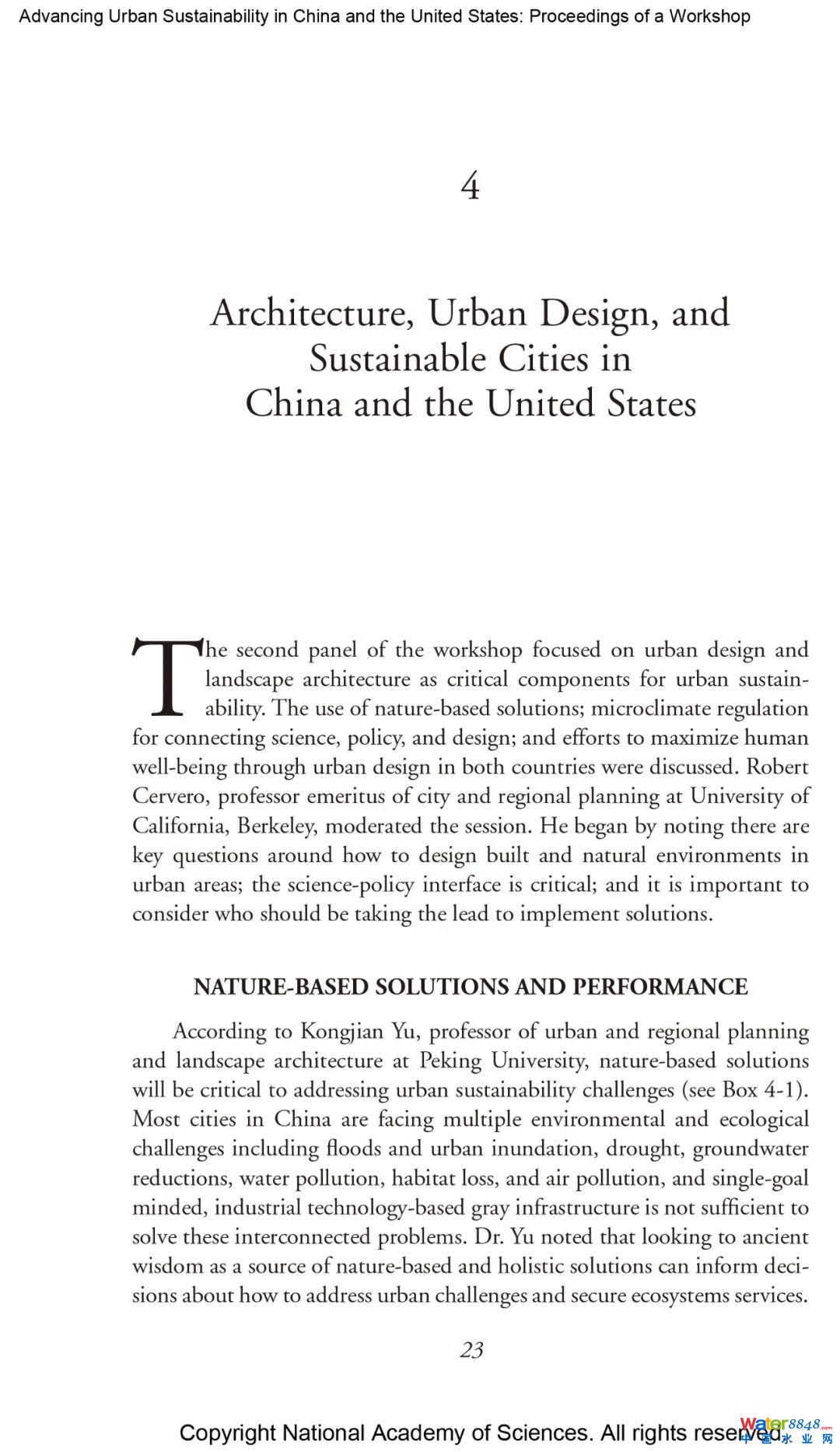 近日,美國科學(xué)院發(fā)布了《中美可持續(xù)城市研究進展》報告,北京大學(xué)建筑與景觀設(shè)計學(xué)院俞孔堅教授團隊基于自然的解決途徑及海綿城市研究成果受到關(guān)注。此報告為美國科學(xué)院可持續(xù)發(fā)展科學(xué)與技術(shù)項目聯(lián)合中國科學(xué)院舉辦的“中國與美國的可持續(xù)城市問題”研討會上所取得的研討成果。參與成員為中美兩國可持續(xù)城市、綠色基礎(chǔ)設(shè)施、可持續(xù)交通、城市人口健康、氣候變化緩解與適應(yīng)、城市洪澇問題等方面的杰出學(xué)者及業(yè)界代表。