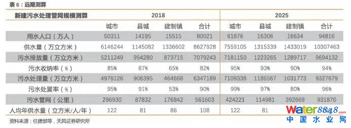 《方案》將城鎮(zhèn)污水收集管網(wǎng)建設(shè)作為補短板重中之重,“十三五”期間規(guī)劃新增污水管網(wǎng)12.59萬公里,老舊污水管網(wǎng)改造2.77萬公里,合流制管網(wǎng)改造2.87萬公里,2020為收官之年,建設(shè)進度或?qū)⒓涌臁?jù)生態(tài)環(huán)境部統(tǒng)計,2018年全國僅污水管網(wǎng)缺口就有約40萬公里,資金缺口在萬億元以上。我們從短期和遠(yuǎn)期兩個視角對管網(wǎng)投資進行測算:短期預(yù)計2019-2020年管網(wǎng)建設(shè)所需總投資額約1036億,其中新建污水管網(wǎng)投資約356億元;遠(yuǎn)期測算方面,我們基于多項假設(shè),包括到2025年城市、縣城、建制鎮(zhèn)的污水收納率可達(dá)95%、93%和90%;用水人口年復(fù)合增幅分別為3%、2%、1%;污水處置率提高至99%、97%、80%等,預(yù)計2019-2025年污水管網(wǎng)長度將增加37萬公里,按照單位投資額1695元/米測算,對應(yīng)市場空間6276億。