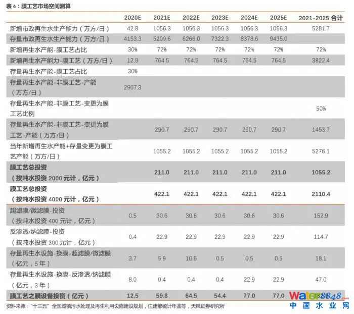 在我們2020年6月19日的外發(fā)報告《污水資源化如何形成千億市場規(guī)模?》中,我們基于“再生水利用率”、“污水處理量增速”等七項假設(shè)前提,認(rèn)為在污水資源化大潮下, 2021-2025年再生水利用設(shè)施建設(shè)-膜工藝總投資額預(yù)計為1055-2110億,其中膜材料銷售及換膜市場約333億元。