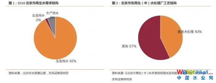 污水資源化技術(shù)路線多樣,從我國需求角度來看,膜技術(shù)適用性較強。 再生水處理工藝大致可分為以物化處理為主的“老三段”工藝(混凝-沉淀-過濾)、以生物反應(yīng)為主的生物處理技術(shù)、以超濾、微濾和反滲透膜技術(shù)為主的“膜處理”工藝,MBR 工藝及生物工藝適用于環(huán)境用水要求高的用戶。 從需求角度看,以北京為例,2018年北京市再生水利用量供給10.76億立方米,其中92.1%是生態(tài)用水,用于景觀環(huán)境用水等。 根據(jù)文獻《北京市再生(中)水開發(fā)利用現(xiàn)狀及風(fēng)險分析》中的統(tǒng)計,北京市各再生( 中) 水處理廠中膜技術(shù)處理水量約190萬噸/日,占比43%。