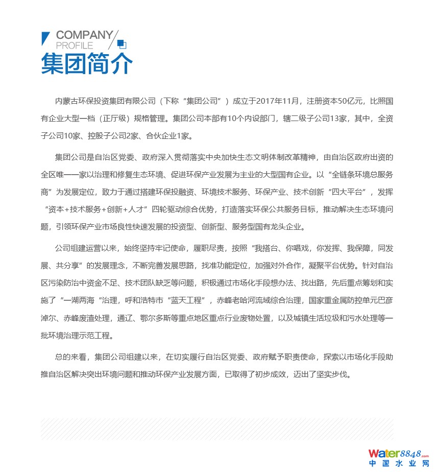企業(yè)簡介: 內(nèi)蒙古環(huán)保投資集團(tuán)有限公司(以下簡稱“內(nèi)蒙古環(huán)投集團(tuán)”)正式成立于2017年11月,注冊資本50億元,比照國有企業(yè)大型一檔(正廳級)規(guī)格管理。內(nèi)蒙古環(huán)投集團(tuán)的組建是自治區(qū)黨委、政府立足推進(jìn)內(nèi)蒙古環(huán)保產(chǎn)業(yè)發(fā)展和生態(tài)環(huán)境治理與保護(hù),加快解決環(huán)境問題歷史欠賬,以市場化手段助力全面打贏污染防治攻堅戰(zhàn)的實際,于2016年1月經(jīng)自治區(qū)人民政府第63次常務(wù)會議作出的重要決策部署。 內(nèi)蒙古環(huán)投集團(tuán)是自治區(qū)人民政府出資的唯一一家以治理和修復(fù)生態(tài)環(huán)境、促進(jìn)環(huán)保產(chǎn)業(yè)發(fā)展為主業(yè)的大型國有企業(yè),以“全鏈條環(huán)境總服務(wù)商”為發(fā)展定位,具有環(huán)保投融資、環(huán)境技術(shù)服務(wù)、環(huán)保產(chǎn)業(yè)、技術(shù)創(chuàng)新“四大平臺”功能,致力于打造落實環(huán)保公共服務(wù)目標(biāo),推動解決生態(tài)環(huán)境問題,助力綠色發(fā)展,引領(lǐng)環(huán)保產(chǎn)業(yè)市場良性快速發(fā)展的投資型、創(chuàng)新型、服務(wù)型國有龍頭企業(yè)。