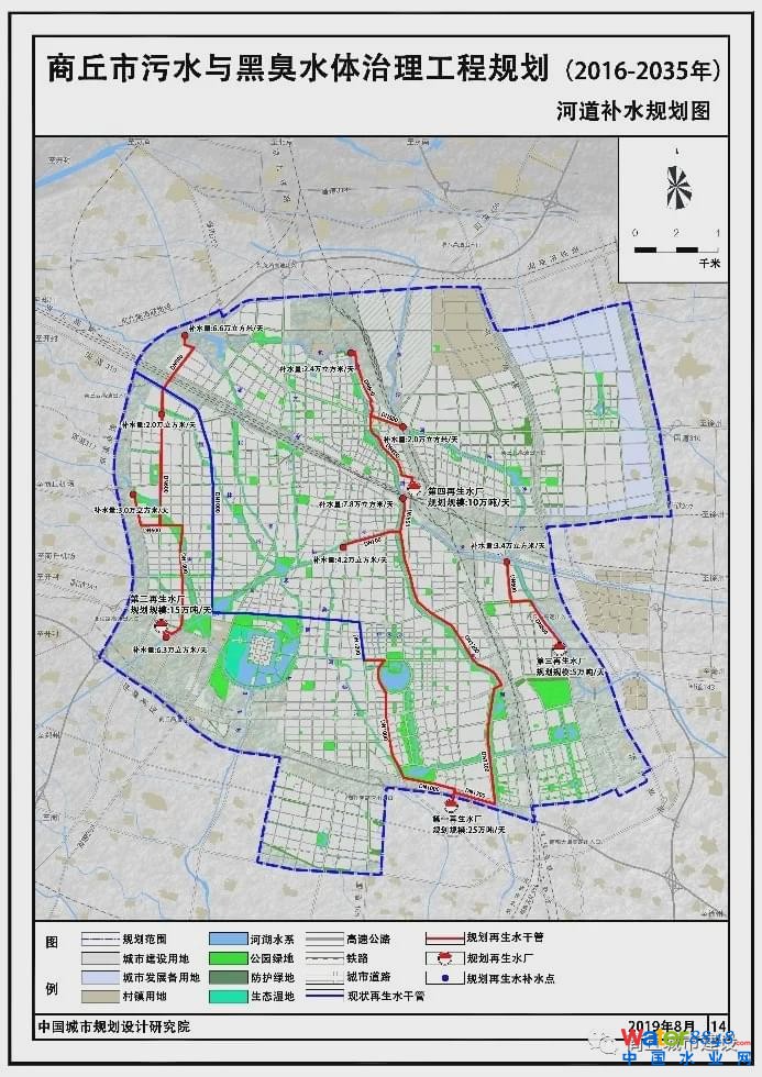 規(guī)劃遠(yuǎn)期商丘市中心城區(qū)再生水量為55萬(wàn)立方米/日,再生水的工業(yè)用水需求量7.1萬(wàn)立方米/日,市政澆灑用水需求量10.2萬(wàn)立方米/日,剩余的再生水全部用于河道生態(tài)補(bǔ)水,可提供補(bǔ)水量37.7萬(wàn)立方米/日。