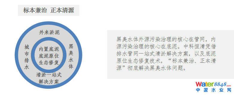 黑臭水體外源核心在排水,內(nèi)源核心在底泥。中科恒清提出“標本兼治、正本清源”的黑臭水體治理理念。