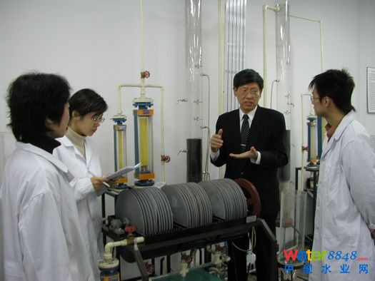 彭永臻教授在指導(dǎo)研究生共同討論污水處理的研究課題