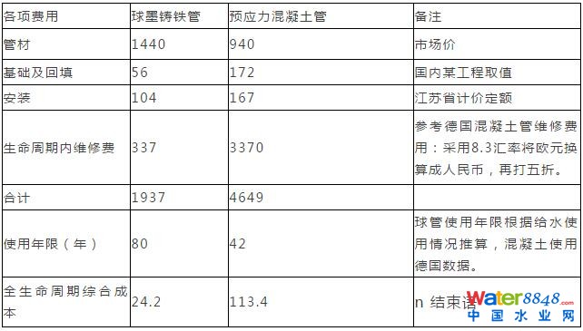DN1000球墨鑄鐵管與預(yù)應(yīng)力混凝土管的綜合成本分析 單位:元/米