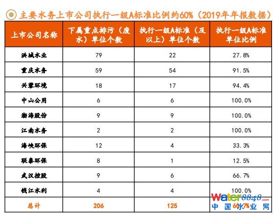污水處理廠提標(biāo)改造需求帶來(lái)廣闊市場(chǎng)空間。雖然我國(guó)污水處理率已處于較高水平,但出水水質(zhì)還有待提升。隨著我國(guó)對(duì)環(huán)境保護(hù)的要求不斷提高,越來(lái)越多的污水廠排放標(biāo)準(zhǔn)由原來(lái)的《城鎮(zhèn)污水處理廠污染物排放標(biāo)準(zhǔn)》(GB18918-2002)中的二級(jí)、一級(jí) B 標(biāo)準(zhǔn)提升為一級(jí) A 或者更高標(biāo)準(zhǔn),污水處理廠提標(biāo)改造迫在眉睫。截止2019年底,我們統(tǒng)計(jì)主要上市公司一級(jí)A標(biāo)準(zhǔn)執(zhí)行率約60%,提標(biāo)改造空間較大。