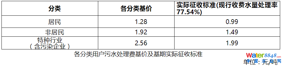 各分類污水處理費(fèi)征收標(biāo)準(zhǔn)=各分類污水處理費(fèi)基價×實(shí)際收費(fèi)水量處理率。