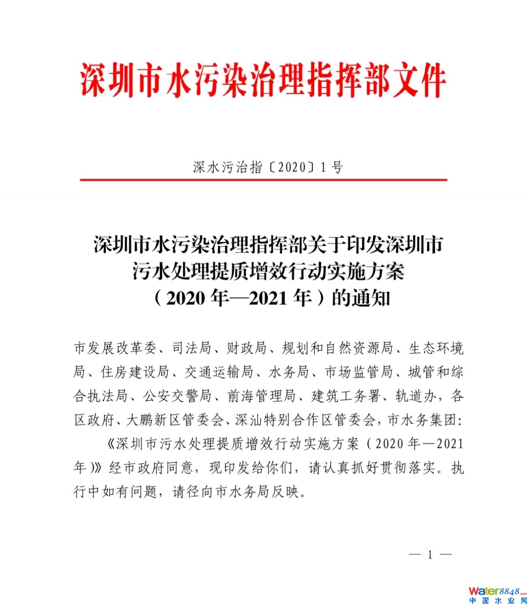 深圳市水污染治理指揮部關(guān)于印發(fā)深圳市污水處理提質(zhì)增效行動實(shí)施方案(2020 年—2021 年)的通知