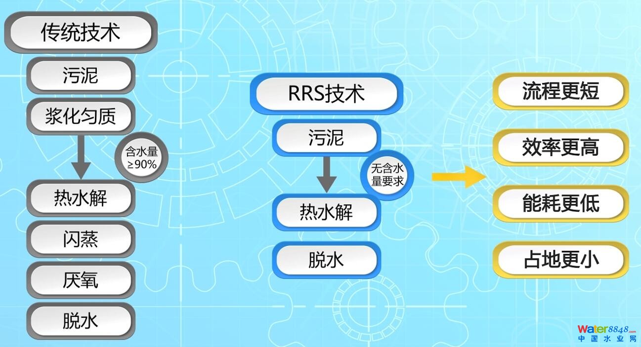 RRS®技術(shù)是環(huán)源科技針對污泥等高含水有機固廢而研發(fā)的新一代資源化處理技術(shù)。2012年,環(huán)源科技推出第一代RRS®技術(shù)——RRS®亞臨界熱水解技術(shù)。該技術(shù)克服了傳統(tǒng)熱水解技術(shù)的含固率限制,流程更短、效率更高、能耗更低、占地更小,投資和運營成本更低;在能效、環(huán)保等方面更遙遙領(lǐng)先于熱干化和化學(xué)調(diào)理等其他傳統(tǒng)技術(shù)。