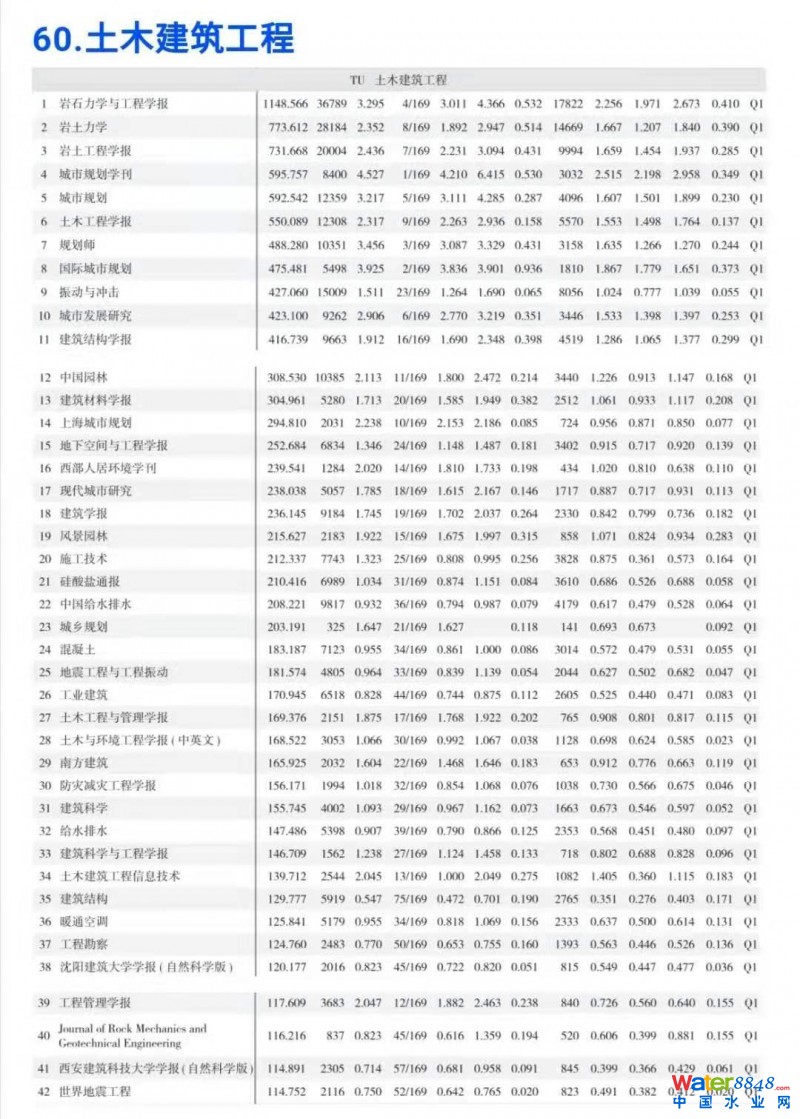 土木建筑工程領域Q1區(qū)共42種期刊,《中國給水排水》位列第22名。該領域Q1區(qū)期刊名錄如下: