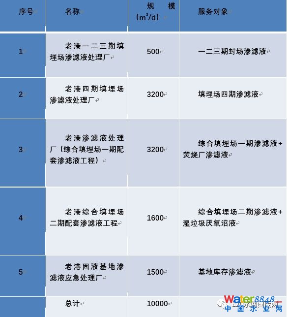 老港固廢基地中已建有五個滲濾液處理廠:老港一二三期填埋場滲濾液處理廠,規(guī)模為500噸/天,服務對象為一二三期封場滲濾液;老港四期填埋場滲濾液處理廠規(guī)模為3200 m3/天,服務對象為填埋場四期滲濾液;老港滲濾液處理廠(綜合填埋場一期配套滲濾液工程),服務于綜合填埋場一期的滲濾液以及焚燒廠的滲濾液,規(guī)模也是3200 m3/天。三座滲濾液處理廠已建成,并在穩(wěn)定運行中。基地中第四座滲濾液處理廠為老港綜合填埋場二期配套滲濾液工程,服務對象是綜合填埋場二期的滲濾液以及老港濕垃圾厭氧發(fā)酵產(chǎn)生的沼液,規(guī)模是1600 m3/天。第五座滲濾液處理廠采取購買服務的方式,主要處理基地庫存滲濾液,規(guī)模為1500 m3/天。