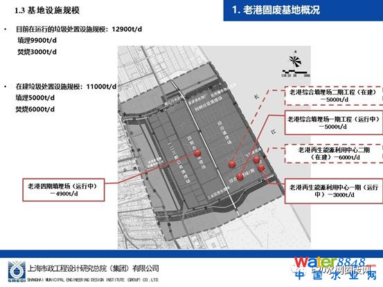 老港固體廢棄物綜合利用基地位于上海浦東,距中心城區(qū)約70公里。它承擔了上海70%的生活垃圾末端處置任務。老港基地東面靠海,北面、南面以及西側(cè)分別留有1km寬度的建設控制區(qū),整個老港規(guī)劃面積29.5平方米,建設實施區(qū)15.3平方公里,控制區(qū)14.2平方公里。本次演講主要分享的是老港固廢基地里面跟滲濾液處理有關(guān)的項目,目前基地中在運行的垃圾處置設施規(guī)模達到12900噸/天,其中填埋是9900噸/天,焚燒為3000噸/天。在建垃圾處置設施規(guī)模為11000噸/天,其中填埋為5000噸/天,焚燒為6000噸/天。