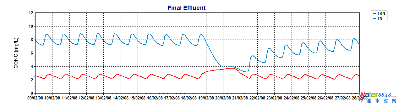 5. 模型應(yīng)用工程師與建模人員制定了幾種備選的保守型升級法案,經(jīng)過在模型中使用后發(fā)現(xiàn)升級工藝中的曝氣系統(tǒng)(在氧化溝部分段增設(shè)曝氣頭)后穩(wěn)態(tài)下可以滿足提標后的要求。隨后又運用該模型對以下情景進行了動態(tài)模型: