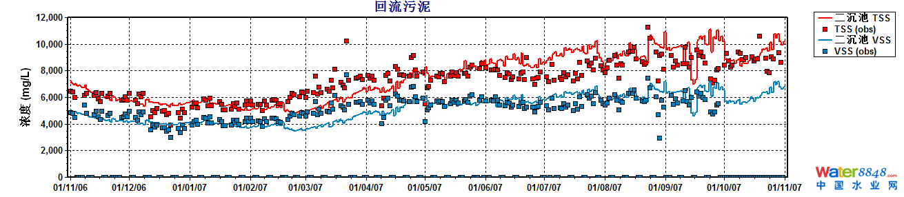 通過對該污水廠過去一年的數(shù)據(jù)的分析和補充實驗數(shù)據(jù)的分析,確定了污水處理廠進水水質(zhì)組分,并調(diào)整參數(shù)對模型進行了校正。校正后的模型可以較好地模擬一年內(nèi)污水廠的運行情況。