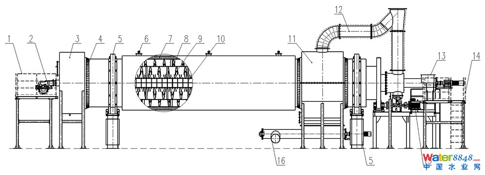 1. 燃燒器檢修平臺;2.燃燒器;3.熱解室;4.密封裝置;5.托輥支撐裝置;6.測溫計;7.外層能量釜保溫裝置;8.外釜;9.內(nèi)釜;10.物料打散裝置;11.成品料收集裝置;12.廢氣集中排放管道;13.進(jìn)料機構(gòu);14.進(jìn)料機構(gòu)檢修平臺;15.內(nèi)外釜主動力裝置;16.排渣出料機構(gòu)。