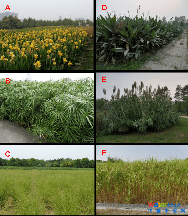 A :美人蕉科(美人蕉); B :風(fēng)車草屬(傘草); C :巖蘭草屬(香根草); D :塔利亞屬(再力花); E :蘆竹; F :芒草(荻) (J. Vymazal攝)