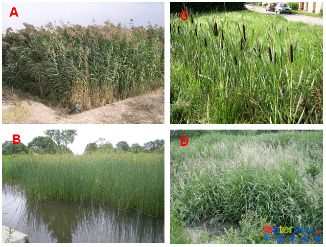 A :蘆葦(常見(jiàn)蘆葦); B :蘆葦(水蔥類); C :香蒲(闊葉香蒲); D :虉草(利甘草)(J. Vymazal攝)