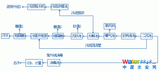 截止2007年8月,注冊資本1325萬元,資產(chǎn)總額1780萬元,現(xiàn)有職工18人。該廠是靜?h第一個污水處理廠,也是天津市自來水集團(tuán)有限公司第一個采取BOT形式建設(shè)的項目。該廠日處理能力為1.5萬噸,采用厭氧水解生物過濾處理技術(shù),其工藝流程為厭氧水解酸化—曝氣—高負(fù)荷生物濾池—紫外線消毒處理。該廠自 2006年3月投產(chǎn)運行,通過了環(huán)境保護(hù)行政主管部門的驗收。