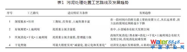 污泥處置方案多種多樣,但最終目的是要達(dá)到“無害化、減量化、資源化”,選用何種工藝必須與當(dāng)?shù)氐膶?shí)際情況相適應(yīng)。例如國內(nèi)大多數(shù)污水處理廠的污泥處置是以深度脫水后外運(yùn)填埋為主,但是在一些土地資源緊缺的發(fā)達(dá)型城市,通常會選用污泥干化焚燒工藝,焚燒后的灰渣,根據(jù)其重金屬含量,可選擇直接或使用重金屬螯合劑處理后進(jìn)入填埋場,也可用作建筑材料或鋪路等;在一些土地資源豐富的欠發(fā)達(dá)地區(qū),深度脫水+填埋這條工藝路線實(shí)為最切合實(shí)際、經(jīng)濟(jì)可行的,其項(xiàng)目建設(shè)周期短、投資成本較低。常見的幾個污泥處理處置工藝路線及其發(fā)展趨勢如表1所示。