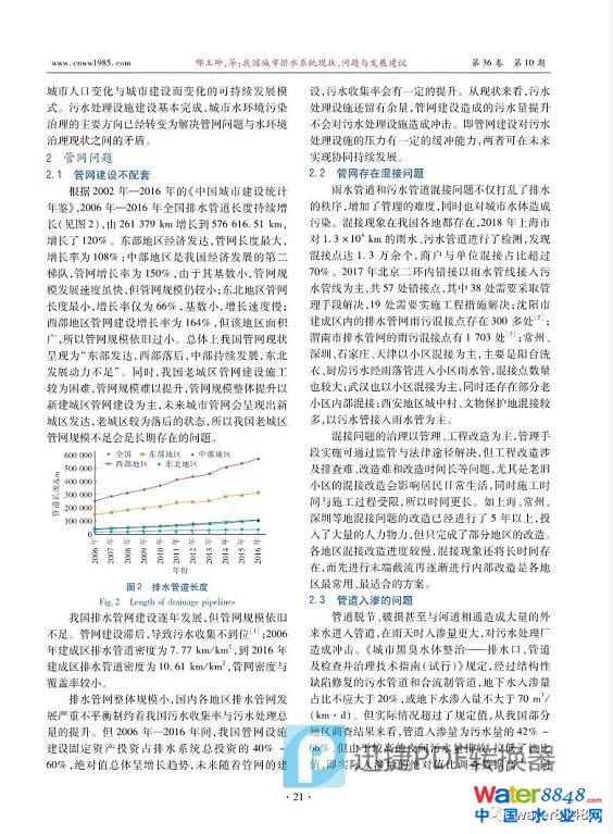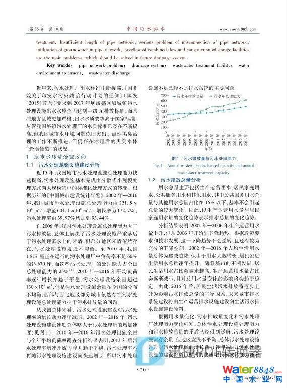 隨著城市化、工業(yè)化速度的加快,我國城市污水排放量逐年增長,污水處理設(shè)施規(guī)模逐年增大,但城市水環(huán)境治理依然存在問題。通過分析2002年—2016年我國城市污水處理設(shè)施的發(fā)展與現(xiàn)狀,發(fā)現(xiàn)我國污水處理設(shè)施的基礎(chǔ)建設(shè)已經(jīng)基本完成,污水排放量與末端處理設(shè)施能力的矛盾已得到緩解且污水處理設(shè)施留有余量,污水處理設(shè)施的建設(shè)由階梯式的快速增長模式轉(zhuǎn)變?yōu)殡S著城市人口變化與城市建設(shè)而變化的可持續(xù)發(fā)展模式。而城市水環(huán)境污染治理的主要方向已經(jīng)轉(zhuǎn)變?yōu)榻鉀Q管網(wǎng)問題與水環(huán)境治理現(xiàn)狀之間的矛盾,管網(wǎng)規(guī)模不足、混接問題嚴(yán)重、地下水入滲、合流制溢流、調(diào)蓄建設(shè)不足是未來排水系統(tǒng)應(yīng)該解決的主要問題。