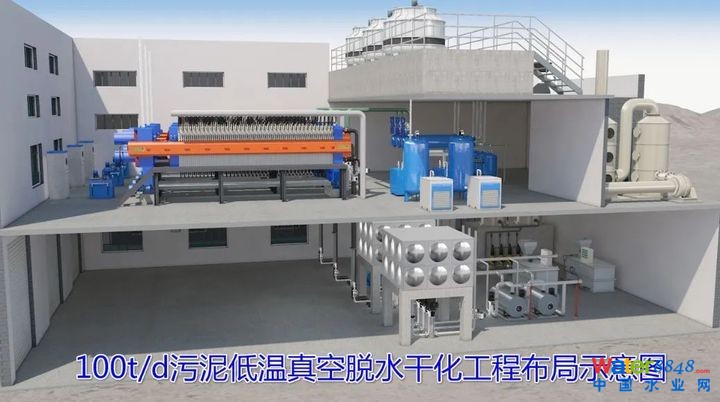 二十二、污泥低溫真空脫水干化一體化技術(shù)典型應用案例工藝路線在線投加絮凝劑,利用隔膜壓濾實現(xiàn)污泥濃縮脫水,在濾板中通入熱水加熱腔室中的濾餅,同時開啟真空泵形成負壓,使濾餅水分深度脫除,實現(xiàn)污泥減量。真空泵抽出的汽水混合物經(jīng)冷凝器、緩沖罐汽水分離后,液態(tài)水和尾氣處理后達標排放。主要技術(shù)指標含水率90%~99%的污泥經(jīng)處理后含水率可降至30%~60%。循環(huán)熱水溫度70℃~95℃。技術(shù)特點通過熱水加熱和負壓蒸發(fā),泥餅含水率低、可調(diào)節(jié)范圍大,處理能耗較低。適用范圍市政污泥脫水干化。案例名稱上海嘉定新城污水處理有限公司100t/d污泥低溫真空脫水干化工程業(yè)主單位上海嘉定新城污水處理有限公司案例概況建設(shè)地點:上海市嘉定區(qū)外岡鎮(zhèn)北龔村88號。工程規(guī)模:污泥處理量約100t/d。投運時間:2016年6月。驗收情況:2017年1月通過驗收。工藝流程1、進料過濾階段:污泥經(jīng)濃縮后(也可不濃縮直接進料)進入儲泥池,經(jīng)進料泵送入低溫真空脫水干化主機系統(tǒng),同時在線投加絮凝劑,利用泵壓使濾液通過過濾介質(zhì)排出,完成固、液兩相分離。2、隔膜壓濾階段:通過濾板內(nèi)的高壓水產(chǎn)生壓榨力,破壞物料顆粒間形成的“拱橋”,使濾餅壓密,將殘留在顆?障堕g的濾液擠出。3、吹氣穿流階段:在隔膜壓濾結(jié)束后,利用壓縮空氣將濾板進料中心孔和污泥管道的殘余污泥吹掃至儲泥池內(nèi),同時,對濾餅中的毛細水進行穿流置換,使濾餅中的毛細水進一步排出降低濾餅水分。4、真空干化階段:在隔膜壓濾結(jié)束后,濾板中通入熱水,加熱腔室中的濾餅,同時開啟真空泵,對污泥腔室進行抽真空,使其內(nèi)部形成負壓,降低水的沸點。濾餅中的水分隨之沸騰汽化,被真空泵抽出的汽水混合物經(jīng)過冷凝器、緩沖罐汽水分離后,液態(tài)水進入儲液罐定期排放,尾氣經(jīng)化學洗滌除臭設(shè)備處理后達標排放。污泥經(jīng)進料過濾、隔膜壓濾、吹氣穿流、真空干化等過程處理后,濾餅中的水分得到充分脫除,污泥量大大減少,實現(xiàn)污泥減量。