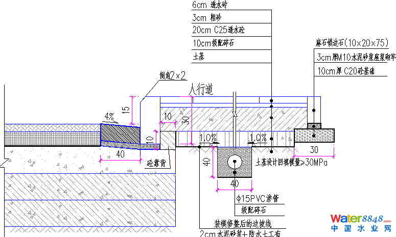 3) 本道路無綠化帶,海綿城市主要是采用透水人行道。將人行道建設(shè)成透水結(jié)構(gòu),人行道與車行道之間采用防滲膜進(jìn)行隔離。人行道路面結(jié)構(gòu)為:透水磚6cm、中粗砂3cm、透水水泥砼C25 20cm、開級(jí)配碎石10cm。