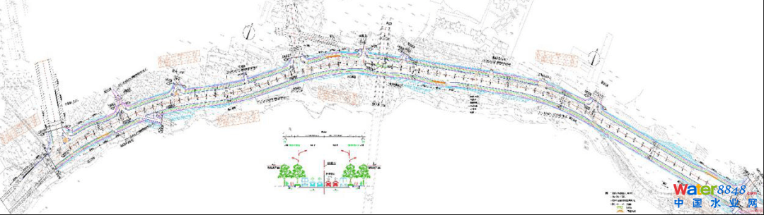 景觀設(shè)計(jì)部分,靠河岸的人行道結(jié)合風(fēng)光帶進(jìn)行了“路堤一體” 設(shè)計(jì),同時(shí),保留沿河岸線自然景觀及原有的歷史文化設(shè)施。