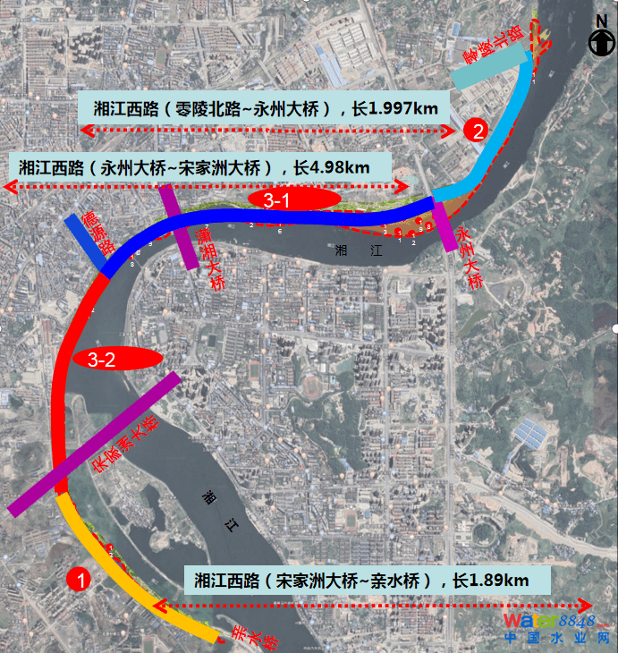 湘江西路按照總規(guī)和控規(guī)要求,其中零陵北路至永州大橋段按規(guī)劃為城市主干道,永州大橋至親水橋段為城市次干道。