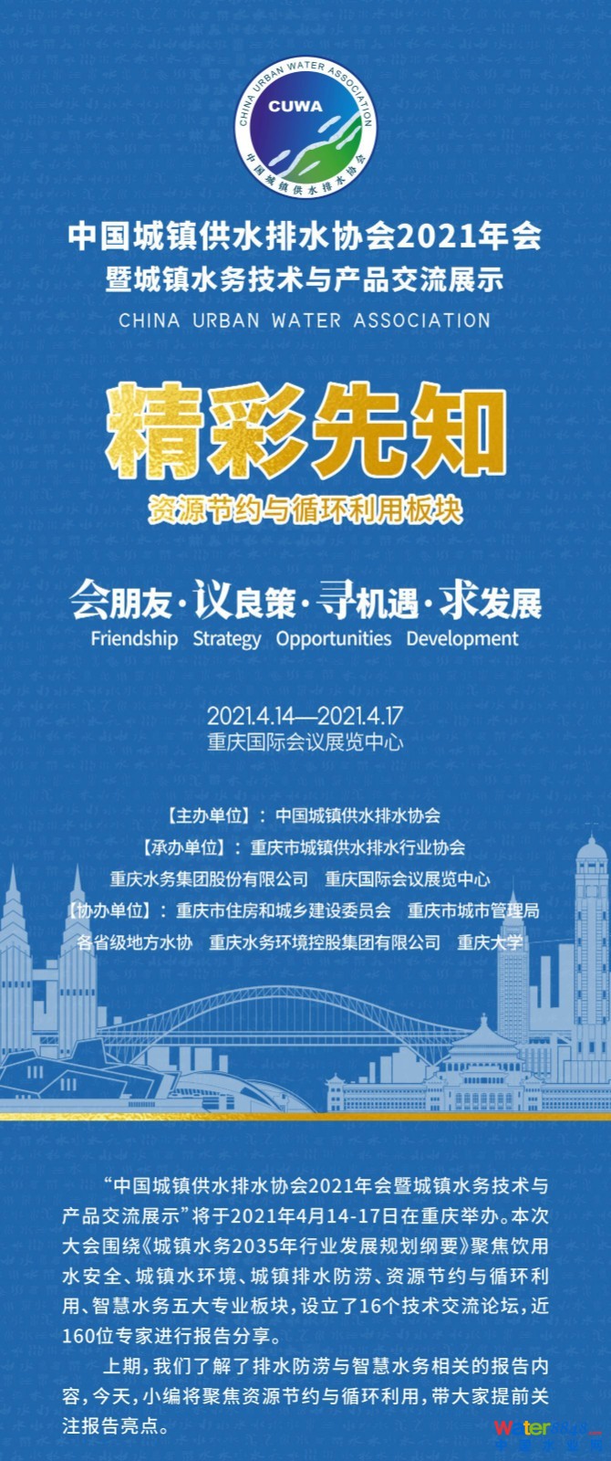 住建部等:中國(guó)給水排水 2021中國(guó)污水資源化利用(再生水利用)大會(huì)邀請(qǐng)函暨征稿啟事 (中國(guó)污水提標(biāo)千人大會(huì)同期會(huì)議) (請(qǐng)?zhí)崆皥?bào)名回執(zhí),限1500人;本次會(huì)議僅限提前回執(zhí)報(bào)名單位代表參會(huì)