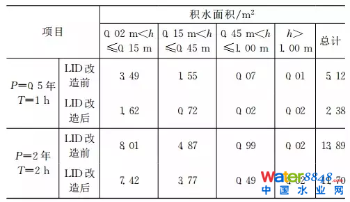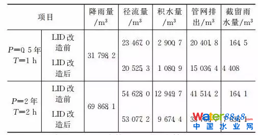 LID改造工程經(jīng)受起了暴雨的考驗,其對雨水徑流的削減控制有明顯的效果,特別是重現(xiàn)期較短歷時較短的降雨。經(jīng)改造后區(qū)域內(nèi)的地表徑流量減少,同時截留的雨水量增加,區(qū)域管網(wǎng)排出系統(tǒng)量有明顯的減少,中心城區(qū)呈現(xiàn)出“海綿吸水”的功能,大大地減輕了城市洪澇現(xiàn)象產(chǎn)生。