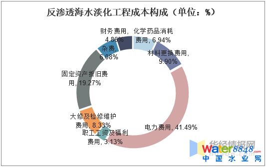 對(duì)于1萬(wàn)t/d反滲透海水淡化工程,占總成本比例最高的主要因素包括電力費(fèi)用、固定資產(chǎn)折舊費(fèi)用、材料更換費(fèi)用和大修及檢修維護(hù)費(fèi)用,分別占比為:41.49%、19.27%、9.90%和8.33%。