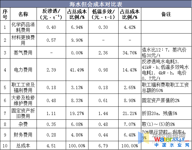 根據(jù)目前國(guó)內(nèi)的技術(shù)水平和條件,以1萬(wàn)t/d反滲透海水淡化工程和低溫多效海水淡化工程為例進(jìn)行海水淡化成本的測(cè)算,具體成本為: