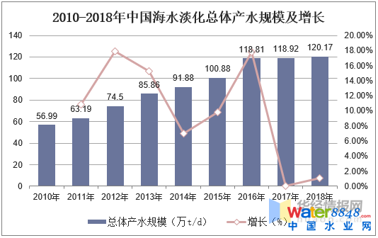 海水淡化作為有效替代天然淡水的途徑,日趨經(jīng)濟(jì)合理。近年來(lái),中國(guó)海水淡化工程總體規(guī)模穩(wěn)步增長(zhǎng),2018年中國(guó)海水淡化總體產(chǎn)水規(guī)模為120.17萬(wàn)t/d,同比增長(zhǎng)1.05%。