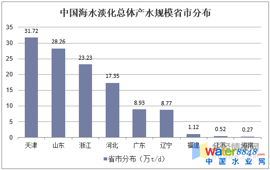 截至2018年底,中國(guó)海水淡化項(xiàng)目主要分布在沿海9個(gè)省(市),產(chǎn)水規(guī)模排前三的分別為天津、山東、浙江省,產(chǎn)水規(guī)模分別為31.72萬(wàn)t/d、28.26萬(wàn)t/d、23.23萬(wàn)t/d。