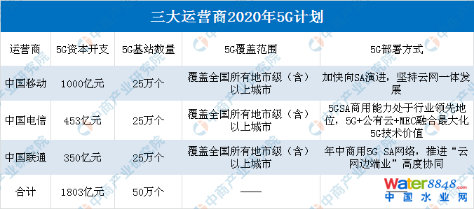 隨著5G通信技術的不斷落地應用,5G為智慧環(huán)保提供網(wǎng)絡支撐。2020年以來,各地加快布局5G,三大運營商也發(fā)布了5G建設計劃。此前,三大運營商披露了2020年5G投資計劃。據(jù)投資計劃顯示:三大運營商2020年將建50萬個基站。其中,中國移動將新建25萬個5G基站,另外,中國電信將與中國聯(lián)通共建約25萬個5G基站,覆蓋全國所有地市級(含)以上城市。具體來看: