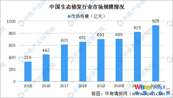 自2012年的十八大以來,中國更加重視生態(tài)文明及環(huán)境保護,并將“美麗中國”的目標納入“十三五”規(guī)劃。2017年十九大強調(diào)了生態(tài)文明建設是中國實現(xiàn)可持續(xù)發(fā)展的關鍵目標。生態(tài)文明建設及生態(tài)修復的推進將為生態(tài)修復行業(yè)企業(yè)提供大量機遇。生態(tài)修復市場增長趨勢迅速,按業(yè)內(nèi)所有企業(yè)的年收益計,2015年市場規(guī)模約319億元,2019年增至693億元,2015年至2019年的復合年增長率約為21.4%。2020年受疫情影響,生態(tài)修復市場增速放緩,市場規(guī)模預計約699億元,2022年市場規(guī)模將達925億元。