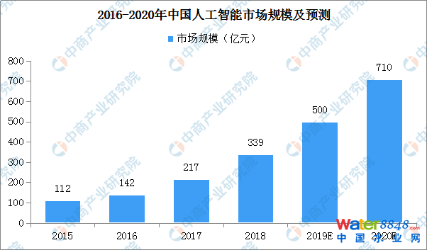 我國政府高度重視人工智能的技術進步與產(chǎn)業(yè)發(fā)展,人工智能已上升國家戰(zhàn)略。人工智能市場前景十分廣闊,隨著人工智能技術的逐漸成熟,應用場景不斷擴展。從市場規(guī)模來看,自2015年開始,中國人工智能市場規(guī)模逐年攀升。數(shù)據(jù)顯示,2018年中國人工智能市場規(guī)模約為339億元,增長率達到56.2%。據(jù)預測,到2020年,中國在人工智能的市場規(guī)模有望達到超710億元。