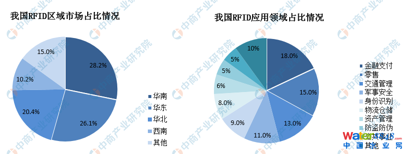 目前,中國RFID產(chǎn)業(yè)呈現(xiàn)以北京、上海、廣東、香港為代表的快速發(fā)展趨勢。從市場分布數(shù)據(jù)為例來看,華南、華北、華東是目前我國RFID市場相對成熟的區(qū)域。從我國RFID在各個領域的應用市場占比情況可以看出,目前金融支付是其應用最大的市場,其次是零售和交通管理。