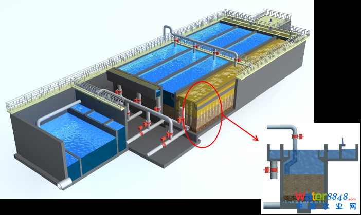 反硝化深床濾池將反硝化與深床過濾功能有機結(jié)合在一起,是集生物脫氮及過濾功能合二為一的處理單元。 設置在二沉池出水之后,可與其它處理單元完滿結(jié)合,具有脫氮、除磷、去除懸浮物等多種功能。