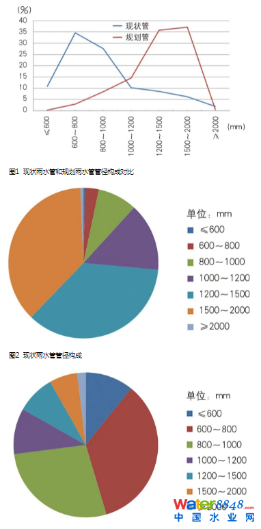 圖1 現(xiàn)狀雨水管和規(guī)劃雨水管管徑構(gòu)成對(duì)比