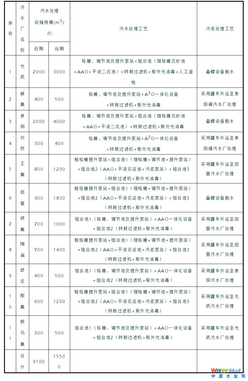 界首市15個鄉(xiāng)鎮(zhèn)新建11座污水處理廠和4座一體化提升泵站,近期設(shè)計總規(guī)模為9100m3/d,遠期設(shè)計總規(guī)模為15500m3/d,配套污水管網(wǎng)約161.87km,配套接戶管總長為229.80km。出水滿足《城鎮(zhèn)污水處理廠污染物排放標準》(GB18918-2002)一級A標準。污泥定期收運,外運處置。