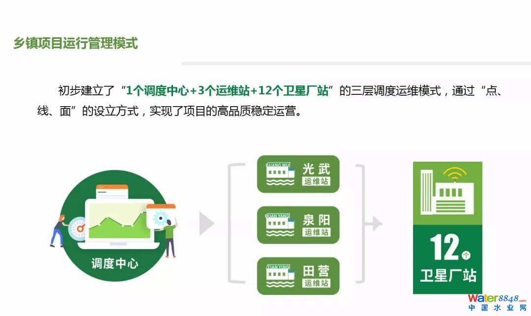 在運營方面,以先進高效的智慧水務(wù)聯(lián)接理念為指導(dǎo),整體設(shè)立“1個調(diào)度中心”,推行管理標準的統(tǒng)一和資源的合理調(diào)配,通過智慧水務(wù)系統(tǒng)實現(xiàn)對所有鄉(xiāng)鎮(zhèn)站點的可視化監(jiān)控和標準化管理。