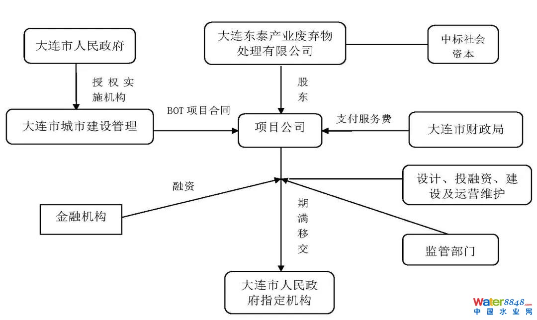 項(xiàng)目采用BOT的運(yùn)營(yíng)模式,特許經(jīng)營(yíng)期包括:特許經(jīng)營(yíng)建設(shè)期,期限為12個(gè)月;特許經(jīng)營(yíng)收費(fèi)期:期限為特許運(yùn)營(yíng)收費(fèi)期之日起20年。在特許經(jīng)營(yíng)期內(nèi),大連市城建局(2018年機(jī)關(guān)事業(yè)單位改革后,調(diào)整為大連市市政公用事業(yè)服務(wù)中心)獲得大連市人民政府授權(quán)管理此項(xiàng)目,有權(quán)簽署有關(guān)協(xié)議,并履行協(xié)議義務(wù)。大連市城建局(目前由大連市市政公用事業(yè)服務(wù)中心)授予大連東泰有機(jī)廢物處理有限公司行使從事夏家河污泥處理廠項(xiàng)目的權(quán)利,該公司享有項(xiàng)目的工程設(shè)計(jì)、建設(shè)、運(yùn)營(yíng)維護(hù)、收取污泥處理費(fèi)的權(quán)利。